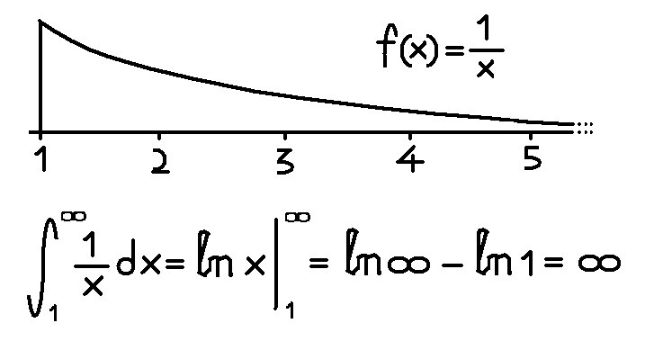 Si le pidiéramos a un pintor que pintara una pared definida por la función f(x) = 1/x y el eje x, donde se supone que x es mayor o igual que 1, no podría reunir la cantidad de pintura necesaria para ello en toda su vida. Al calcular el área del recinto limitado por la curva f y el eje x, desde x=1 hasta el infinito, resulta un área infinita: