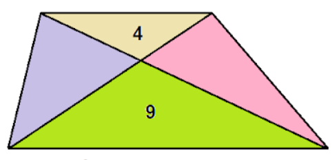 Un trapecio se descompone en cuatro triángulos al trazar sus diagonales. Halla el área de dicho trapecio, sabiendo que las áreas de los triángulos superior e inferior son de 4 y 9 unidades cuadradas, respectivamente.