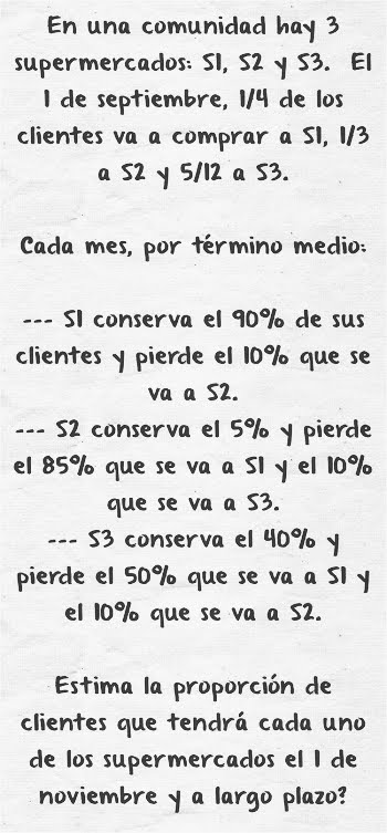 Las cadenas de Markov son modelos probabilísticos que se usan para predecir la evolución y el comportamiento a corto y largo plazo de determinados sistemas. Deben su nombre al matemático ruso Andrei Markov. Consideremos la siguiente situación: