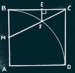 La figura es un cuadrado de lado 8 y M es el punto medio del lado AB. Halla la longitud del segmento EF, perpendicular a BC".