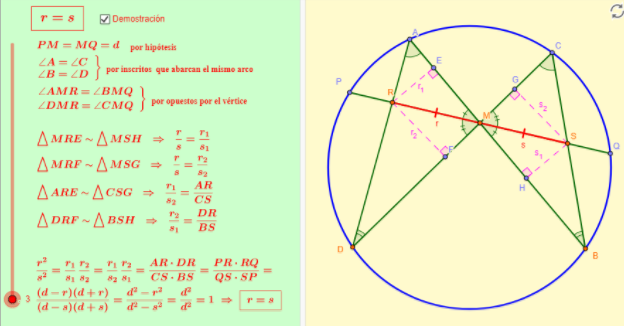 Si M es el punto medio de una cuerda PQ de una cierta circunferencia y AB y CD son también cuerdas de dicha circunferencia pasando por M, entonces este punto M será al mismo tiempo punto medio de RS, siendo R y S las intersecciones de PQ con AD y CB, respectivamente.